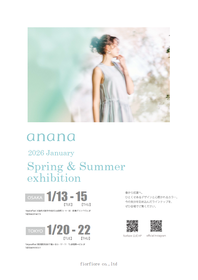 exhibition 2025.12.25 anana 2026 January exhibition OSAKA/2026.1.13(火)-1.15(木) 9:30-18:00 TOKYO/2026.1.20(火)-1.22(木) 9:30-18:00 ※尚、会場の混雑を防ぐために完全アポイント制とさせて頂きます。皆さまのご協力をお願い申し上げます。 スタッフ一同、心よりお待ちしております。 何卒宜しくお願い致します。 株式会社フィオールフィオーレ