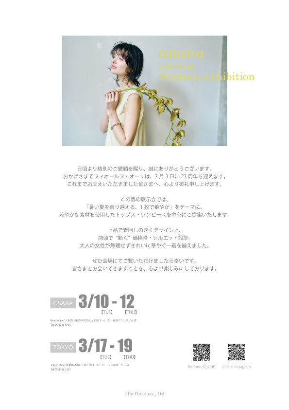 exhibition 2026.02.25 anana 2026 March exhibition OSAKA/2026.3.10(火)-3.12(木) 9:30-18:00 TOKYO/2026.3.17(火)-3.19(木) 9:30-18:00 ※尚、会場の混雑を防ぐために完全アポイント制とさせて頂きます。皆さまのご協力をお願い申し上げます。 スタッフ一同、心よりお待ちしております。 何卒宜しくお願い致します。 株式会社フィオールフィオーレ